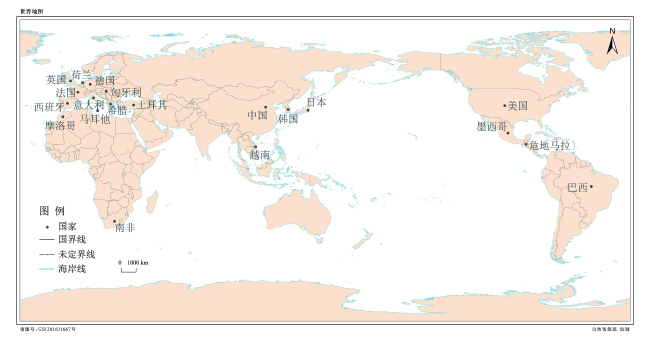 图2 全球旅游绅士化实证研究案例分布注:基于自然资源部标准地图服务网站GS(2016)1667号标准地图制作,底图无修改。 Fig. 2 The case countries distribution of tourism gentrification research in the world |