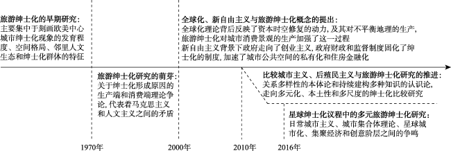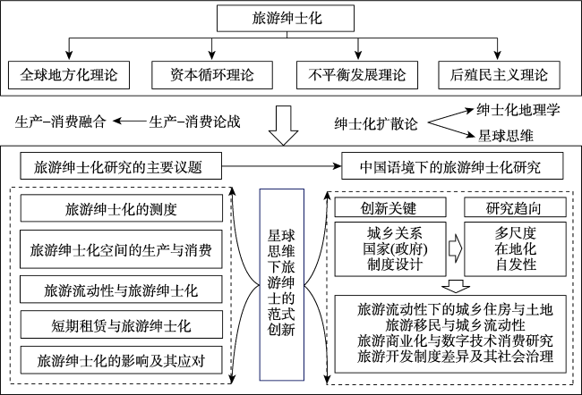 The intricate connection between tourism and gentrification reveals the multifaceted interplay between tourism development and the reconfiguration of urban and rural social landscapes. The concept of ‘tourism gentrification’ offers a valuable lens to dissect the political economy and socio-cultural mechanisms behind this phenomenon. Drawing from a comprehensive analysis of Chinese and Western literature on tourism gentrification, this study yields the following insights: (1) Tourism gentrification emerged in tandem with the evolution of gentrification concepts and phases, aligning itself with the research agenda of planetary gentrification. This framework is profoundly influenced by theories of glocalization, uneven development, circuits of capital, and post-colonialism. (2) Western research topics focus on the measurement of tourism gentrification, the production and consumption of gentrified tourism spaces, links between tourism gentrification and travel patterns, and its intersection with short-term rentals. Scholars also examine its impacts and potential mitigation strategies. (3) In the context of China, the interplay between urban and rural domains, the role of the state (government), and system design offer fertile ground for the development of novel theories on tourism gentrification. (4) Informed by a planetary perspective, tourism gentrification sheds light on a fresh research paradigm emphasizing dynamic, relational, and multi-scale processes in the uneven development of social space propelled by tourism. In the future, the research on tourism gentrification in China needs to understand more deeply the process and mechanism of tourism-driven transformation of urban-rural human-land relations, analyze the issues of social equity and sustainable development, and bring into play the theoretical value of the tourism gentrification perspective in safeguarding spatial justice and realizing common prosperity.