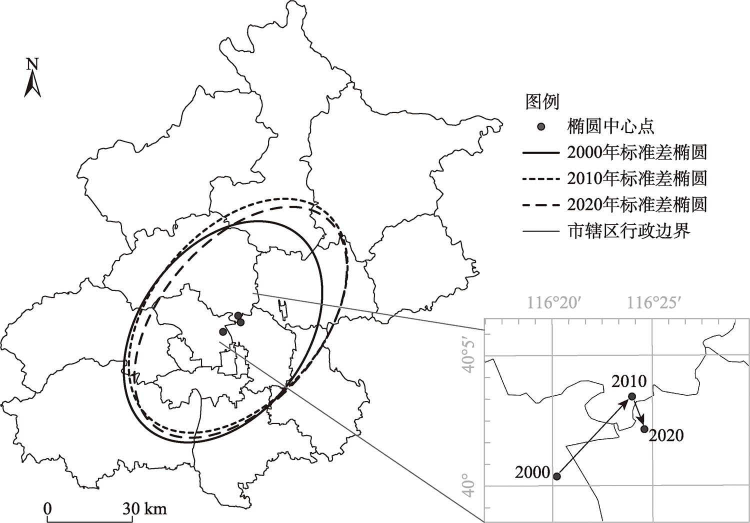 图4 北京市2000、2010、2020年生态游憩空间标准差椭圆分析结果注:该图基于自然资源部标准地图服务网站下载的审图号为GS(2019)1822 号的标准地图制作,底图无修改。 Fig. 4 Standard deviation ellipse analytical results of ecological recreation spaces in Beijing in 2000, 2010, and 2020 |