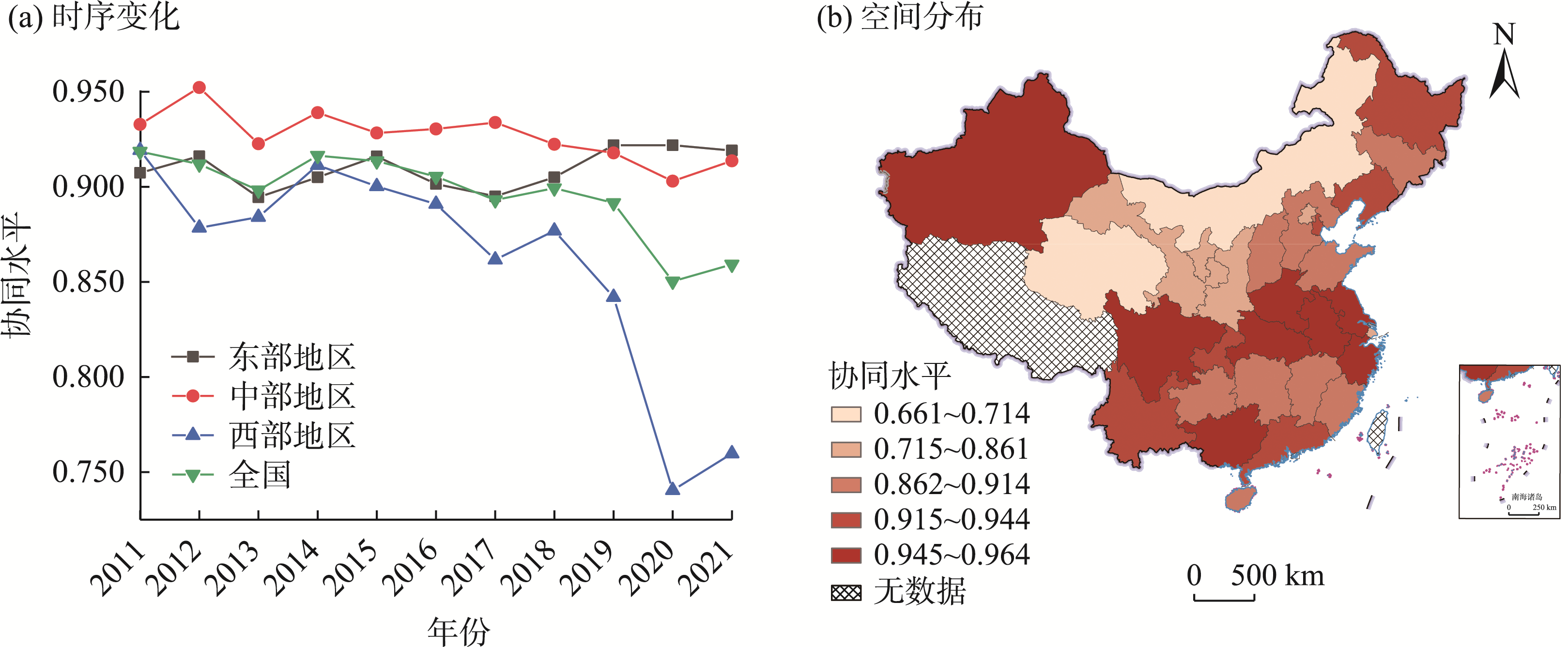 中国和三大区域文化产业和旅游产业效率协同水平时空演变格局