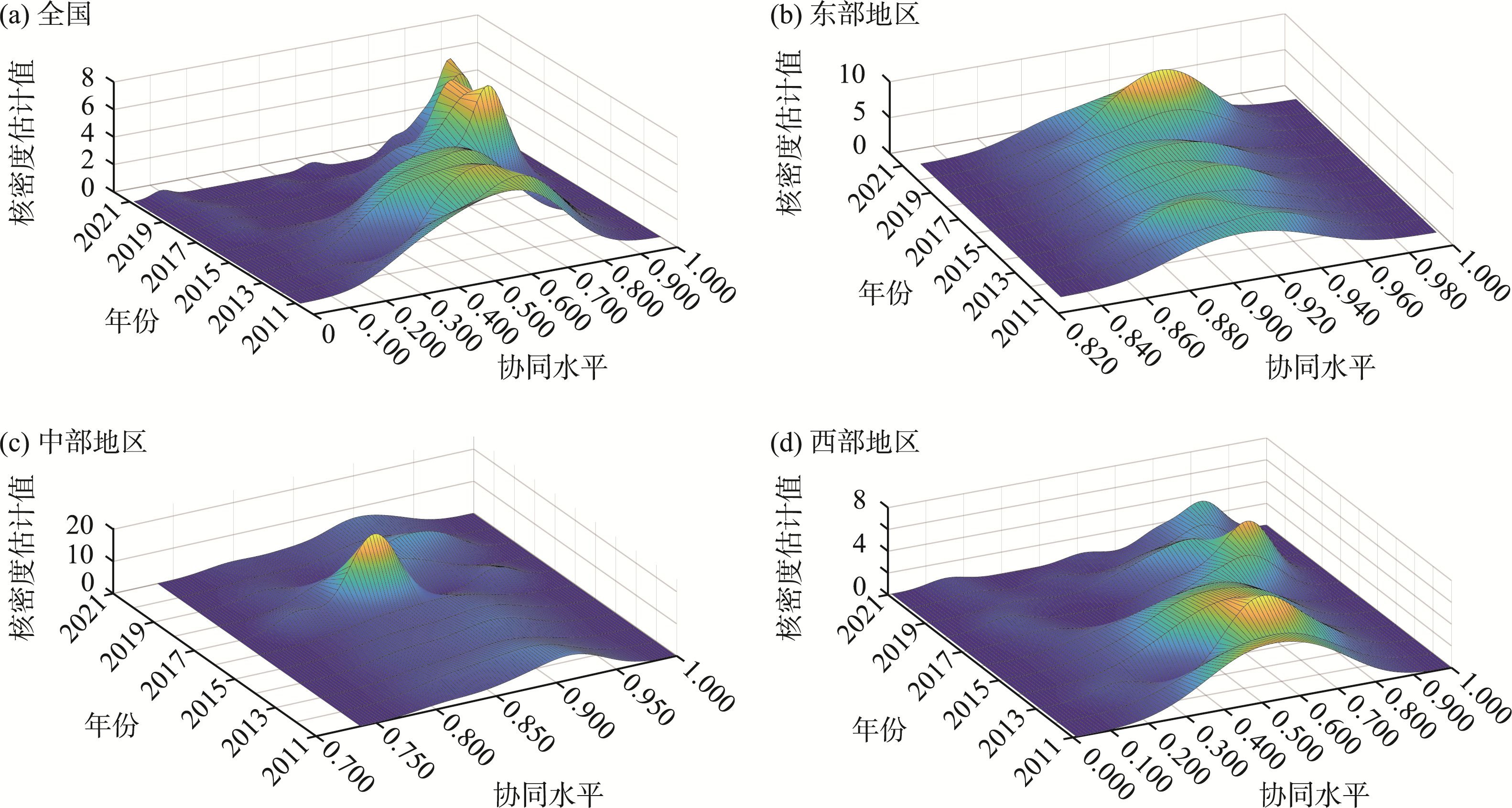 中国和三大区域文化产业和旅游产业效率协同水平三维核密度估计图