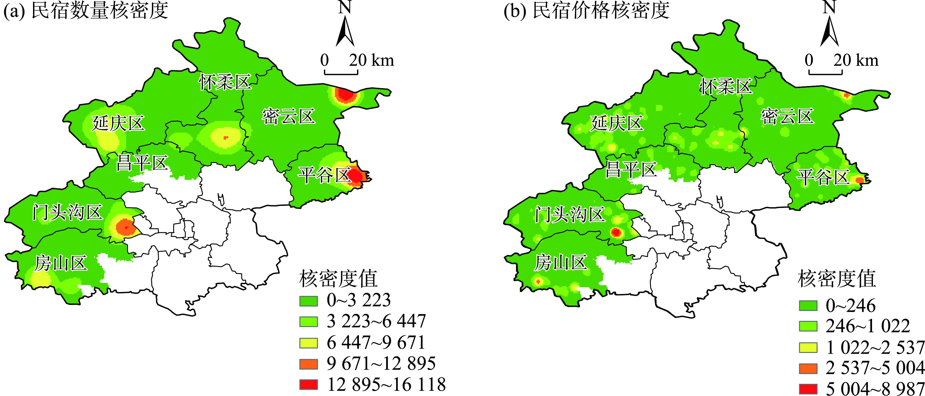 北京市生态涵养区的民宿价格与民宿数量的空间集聚对比