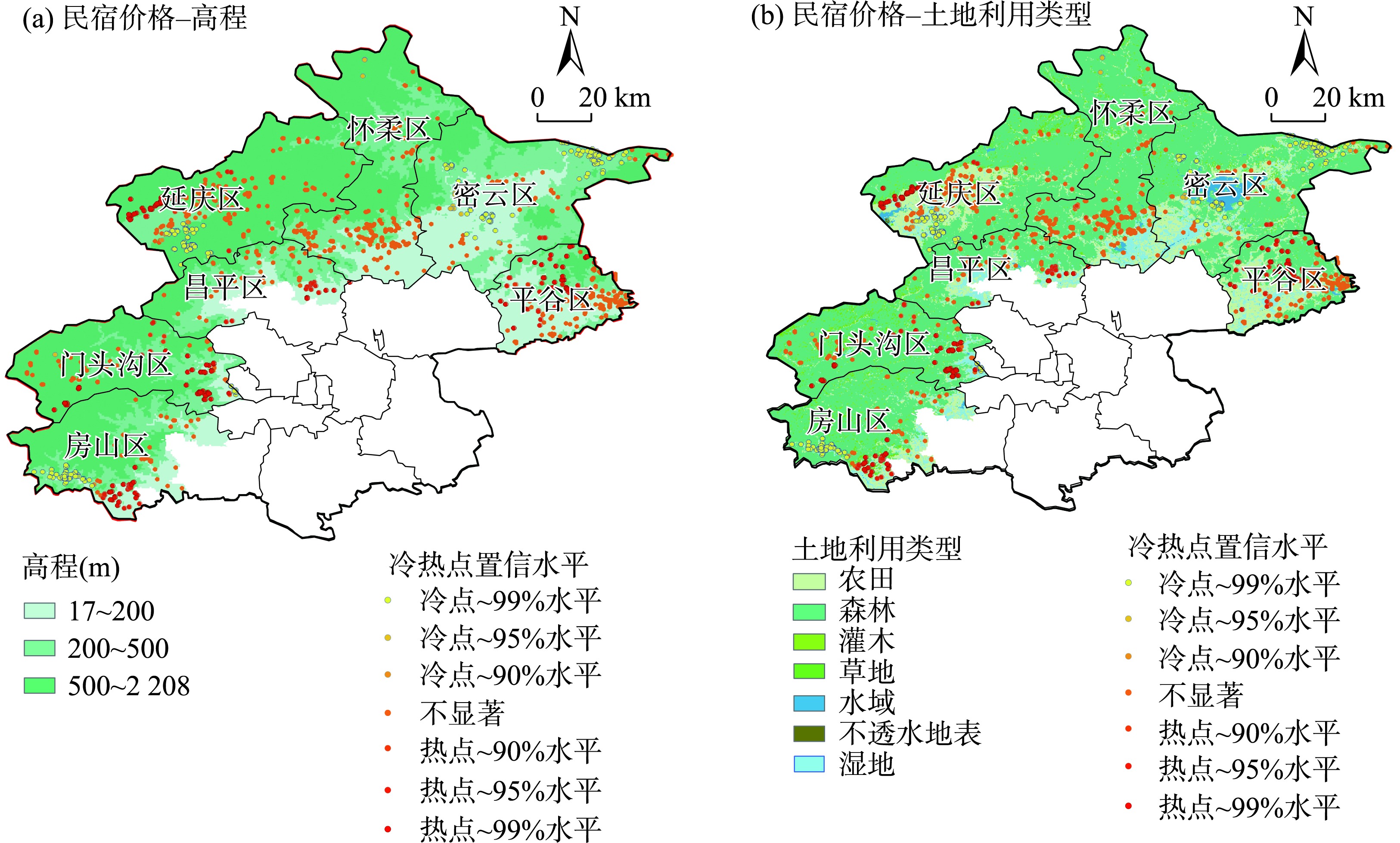 北京市生态涵养区的民宿价格与高程、土地利用类型的复合分布图
