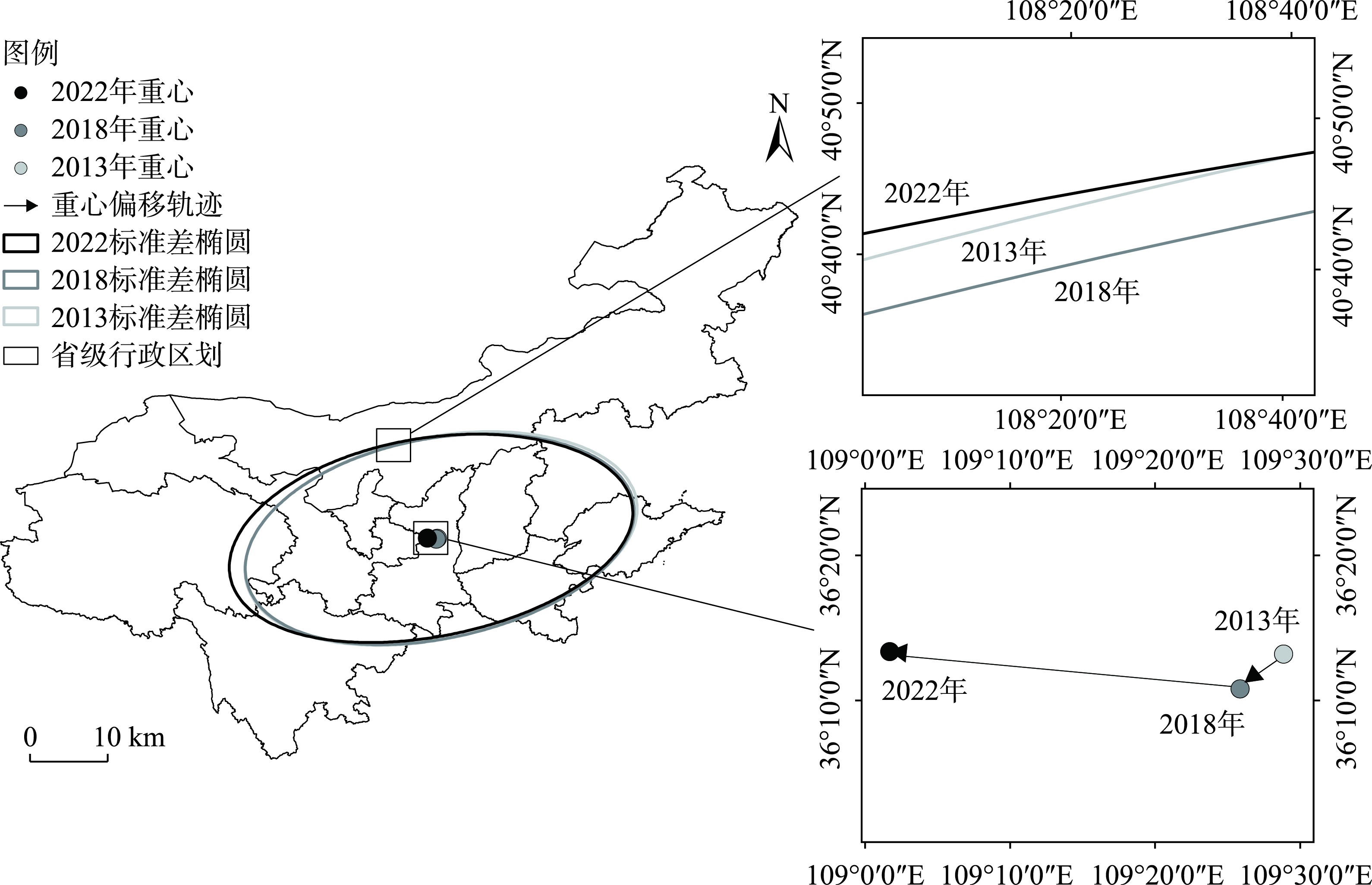 2013—2022年耦合协调度标准差椭圆及其重心