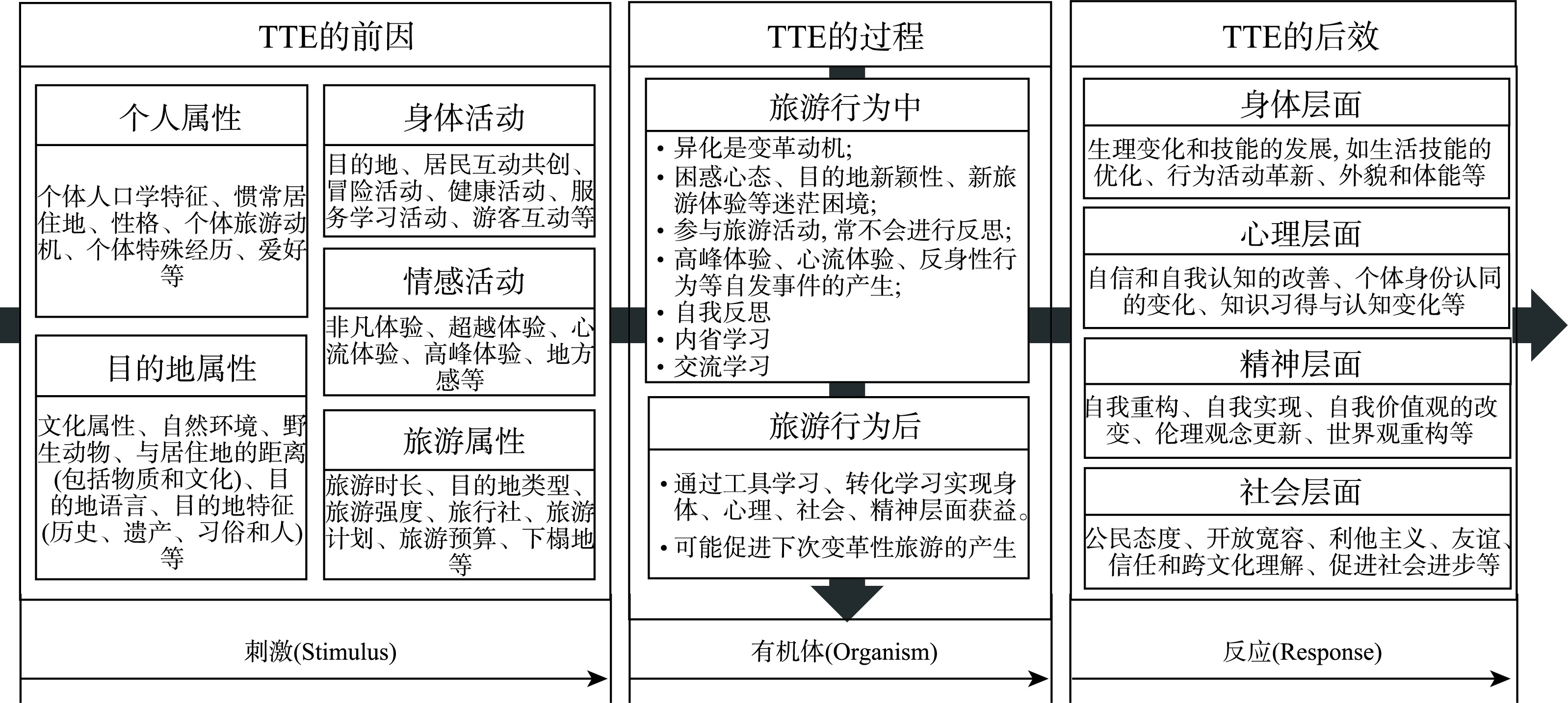 Driven by the transition to an experience economy and the reconstruction of personal existential values, the theoretical construction of transformative tourism experience (TTE) has emerged as a frontier in tourism research. Based on the pertinent English literature from the Web of Science core collection, this study integrates CiteSpace bibliometric analysis and the PRISMA framework, guided by the “Stimulus-Organism-Response” framework and transformative learning theory to systematically deconstruct the generative mechanism of TTE. The research finds that: (1) the antecedents of TTE exhibit five-dimensional interactions encompassing individual attributes, embodied engagement, emotional activation, destination characteristics, and tourism contexts; (2) The process of TTE follows a cyclic feedback mechanism from “disorienting dilemmas-triggers-self-reflection-transformation” to the re-stimulation of transformative tourism, aligning with the transformative learning theory; (3) TTE mainly include four layers of effects: physical, psychological, spiritual and social gains, the key points of its post-effects are prominently reflected in the improvement of individual skills and cognition, self-actualization, and the promotion of social progress, etc. The research framework of “antecedent-process-post-effect” proposed in the study provides theoretical inspiration for the construction of a transformative tourism experience research system in the Chinese scenario and enriches the research paradigm of tourism experience.