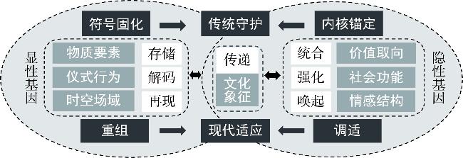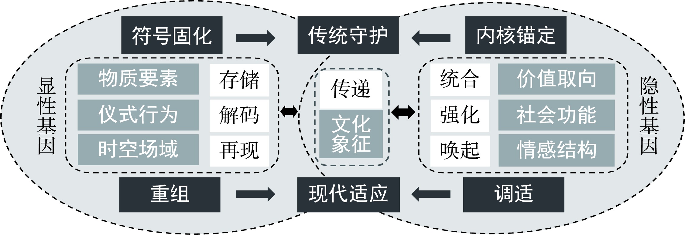 The cultural genes carried by traditional festivals serve as vital link connecting the past and the future, maintaining the continuity of social culture. They play a significant role in preserving regional cultural identity and perpetuating local cultural heritage. Taking the Jingxi Banner Festival as a case study, this research employs interdisciplinary methodologies, including material morphology, semiotics, and psychology, to establish a “explicit-implicit” dual-dimensional gene identification method. Through this approach, the cultural genes are identified and extracted, leading to the construction of a cultural gene system for traditional festivals. The study reveals: (1) the cultural gene system of traditional festivals forms a multi-dimensional, nested cultural ecosystem through the dynamic mutual construction of explicit and implicit genes, thereby maintaining resilience in balancing the preservation of tradition with adaption to modernity. (2) Within explicit genes, the triad of “material elements-ritual behaviors-spatiotemporal contexts” constitutes an expressive chain of “storage-decoding-reproduction”. For implicit genes, the quartet of “cultural symbolism-emotional structure-social function-value orientation” forms an expressive chain of “transmission-evocation-reinforcement-integration”. (3) The “explicit-implicit” dual-dimensional identification method effectively addresses the challenge of representing implicit cultural genes, offering a practical tool for extracting and constructing the cultural gene system of traditional festivals.