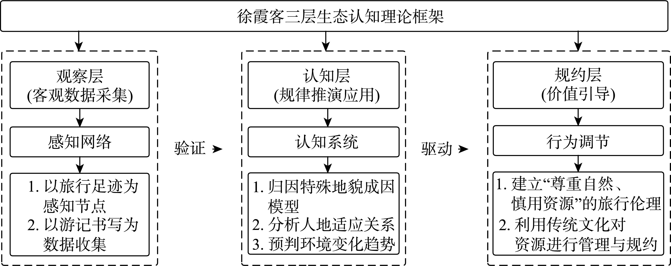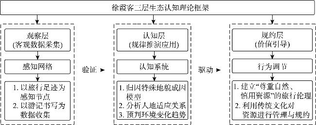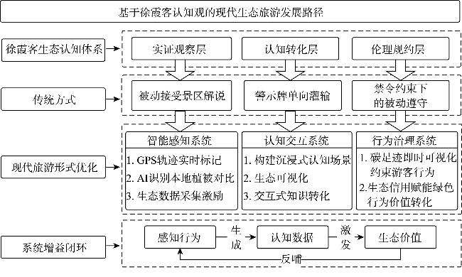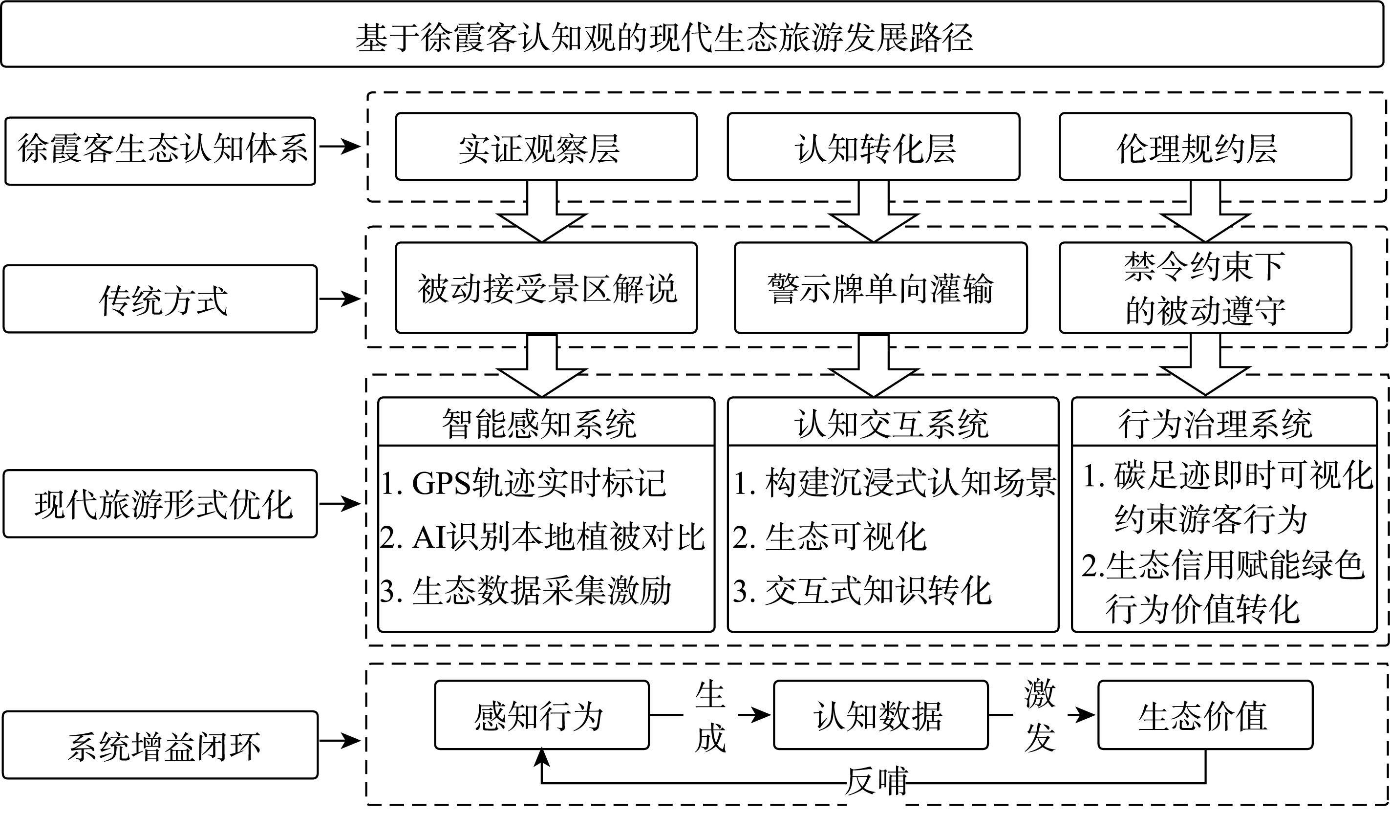 Xu Xiake (1587-1641), the “Sage of Chinese Tourism”, represents a distinctive cultural symbol. The Travels of Xu Xiake not only records rich natural landscapes and social life, but provides a valuable ideological foundation for modern ecotourism. Based on the text of Travels of Xu Xiake, we analyze his travel philosophy, nature observation methods and environmental protection practices from the perspective of Social-Ecological Systems (SES) theory, and explore the value of his view of ecological cognition on modern ecotourism. The study concludes that: (1) travels of Xu Xiake demonstrates the germ of scientific cognition through quantitative investigation and systematic thinking, and reflects traditional Chinese ecological wisdom through local ecological records, condensing the empirical spirit of “action and observation”. (2) During his travels, Xu Xiake formed a three-layer ecological cognitive framework of “observation, cognition and regulation”. The observation layer adopts a distributed recording method combining quantitative measurement and qualitative description to establish an original ecological database; the cognition layer deconstructs and transforms the recorded data to reveal the dynamic laws of the formation process; and the regulation layer transforms the ethical thinking in the process of cognitive transformation into institutional practice. This complete framework contains traditional ecological wisdom and provides a theoretical model for the transformation of ecotourism from superficial sightseeing to sustainable governance. (3) Based on Xu Xiake’s concept of ecological cognition, the future development of ecotourism can be enhanced in three dimensions through digital technology: replacing passive sightseeing with scientific engagement, transcending superficial reception through in-depth cognition, and breaking through external constraints with endogenous behavior drive, ultimately realizing the goal of “travel as a vehicle for harmony between humans and nature”.